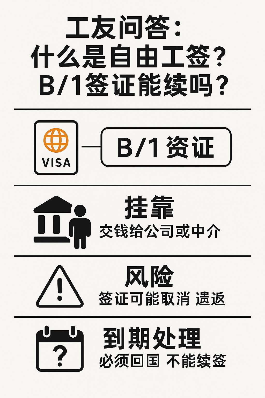 近日,有工友留言询问:“自由签证是什么?为什么每个月交一万多签证费?我持有B1签证,5年后还能续吗?”针对这一问题,我们的公益律师团队做了详细解答: